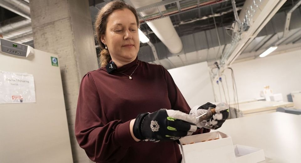 Tove Fall, principal investigator, is holding one of the stool samples analysed in the study.
